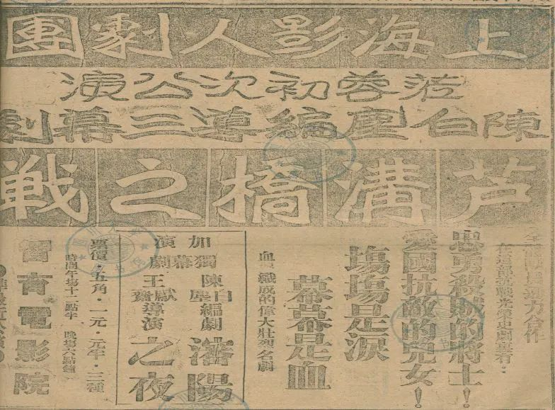 上海影人劇團(tuán)《盧溝橋之戰(zhàn)》廣告 圖據(jù)新明電影院成都電影輕博物館